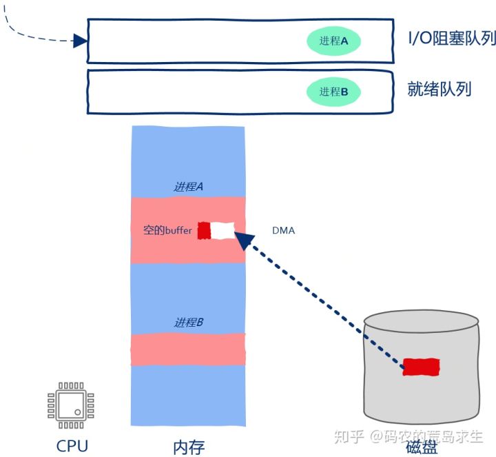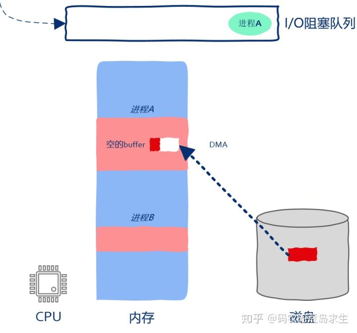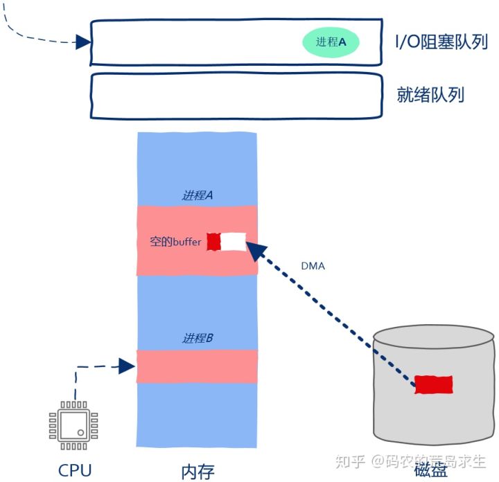 这时操作系统已经向磁盘发送了 I/O 请求,因此磁盘 driver 开始将磁盘中的数据 copy 到进程 A 的 buff 中,虽然这时进程 A 已经被暂停执行了,但这并不妨碍磁盘向内存中 copy 数据。注意,现代磁盘向内存 copy 数据时无需借助 CPU 的帮助,这就是所谓的 DMA(Direct Memory Access),这个过程如图所示: