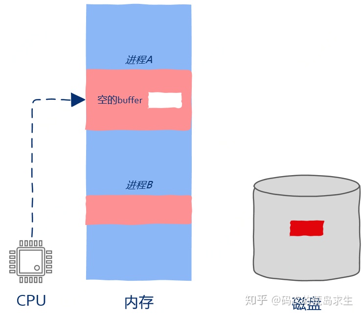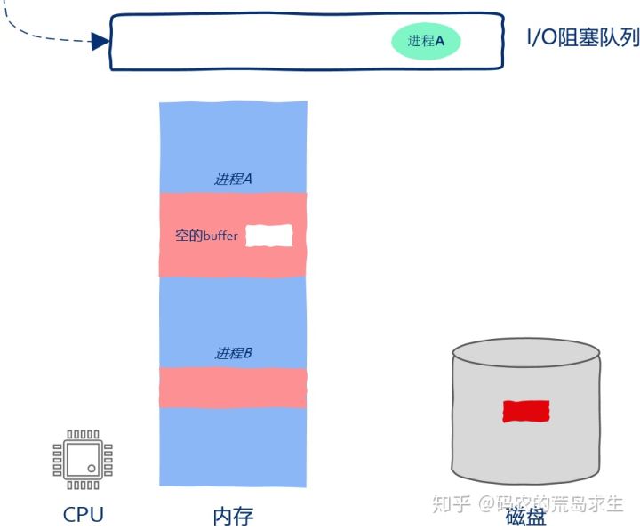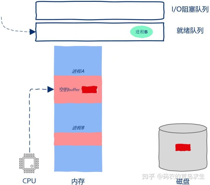 注意观察上图,此时进程 B 在被 CPU 执行,磁盘在向进程 A 的内存空间中 copy 数据,看出来了吗,大家都在忙,谁都没有闲着,数据 copy 和指令执行在同时进行,在操作系统的调度下,CPU、磁盘都得到了充分的利用,这就是程序员的智慧所在。