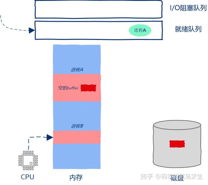 操作系统接收到磁盘中断后发现数据 copy 完毕,进程 A 重新获得继续运行的资格,这时操作系统小心翼翼的把进程 A 从阻塞队列放到了就绪队列当中,如图所示: