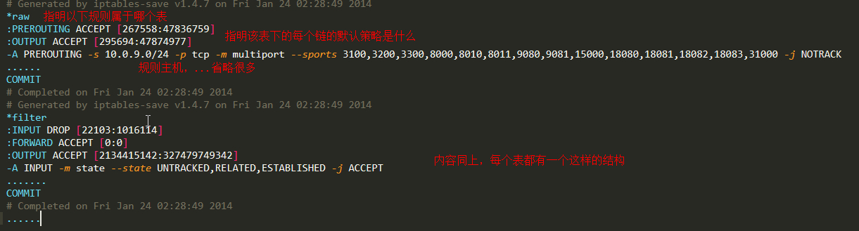 [:]中的内容,冒号左侧是该表处理的总 Packet 数,冒号右侧是该表处理的总 Bytes;使用 iptables 的 -v 选项可以看到每个链上有policy ACCEPT 71326 packets, 4156K bytes)这样的描述,这个数对应[:]中的内容。