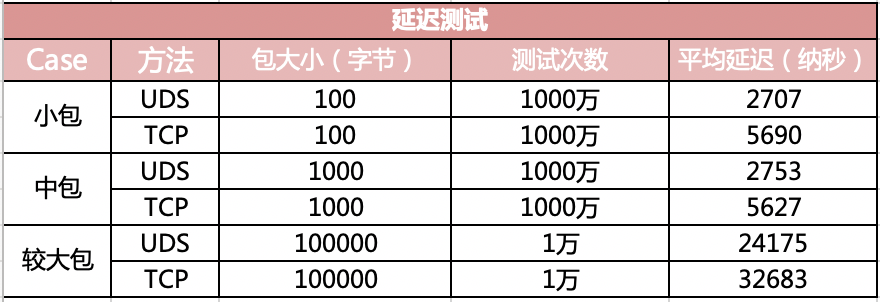可见在小包(100 字节)的情况下,UDS 方法的“网络” IO 平均延迟只有 2707 纳秒,而基于 TCP(访问 127.0.0.1)的方式下延迟高达 5690 纳秒。耗时整整是前者的两倍。