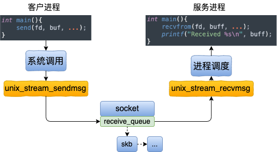 本文分析了基于 Unix Domain Socket 的连接创建、以及数据收发过程。其中数据收发的工作过程如下图。