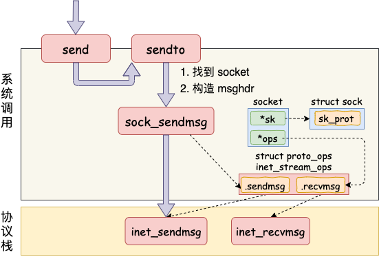 第一是在内核中把真正的 socket 找出来,在这个对象里记录着各种协议栈的函数地址。第二是构造一个 struct msghdr 对象,把用户传入的数据,比如 buffer地址、数据长度啥的,统统都装进去. 剩下的事情就交给下一层,协议栈里的函数 inet_sendmsg 了,其中 inet_sendmsg 函数的地址是通过 socket 内核对象里的 ops 成员找到的。大致流程如图。