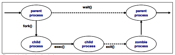 当程序已经执行完成,子进程通过调用 exit()系统调用终止。exit()系统调用释放进程大部分的数据并通过发送一个信号通知其父进程。此时,子进程是一个被叫作僵尸进程的进程(参阅 page 7 的“Zombie processes”)。
