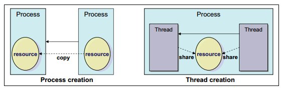 从性能的角度来说,创建线程的开销比创建进程少,因数创建一个线程时不需要复制资源。另一方面,进程和线程拥在调度算法上有相似的特性。内核以相似的方式处理它们。
