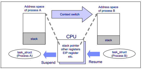 在进程运行过程中,进程的运行信息被保存于处理器的寄存器和它的缓存中。正在执行的进程加载到寄存器中的数据集被称为上下文。为了切换进程,运行中进程的上下文将会被保存,接下来的运行进程的上下文将被被恢复到寄存器中。进程描述和内核模式堆栈的区域将会用来保存上下文。这个切换被称为上下文切换。过多的上下文切换是不受欢迎的,因为处理器每次都必须清空刷新寄存器和缓存,为新的进程制造空间。它可能会引起性能问题。