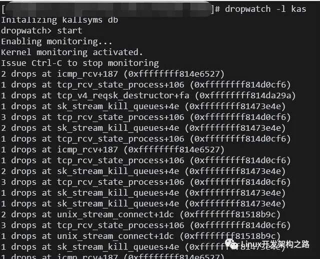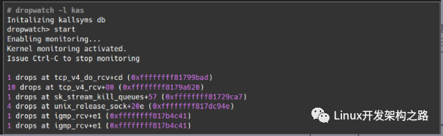 原理: 监听 kfree_skb(把网络报文丢弃时会调用该函数)函数或者事件吗,然后打印对应调用堆栈;想要详细了解 linux 系统在执行哪个函数时丢包的话,可以使用 dropwatch 工具,它监听系统丢包信息,并打印出丢包发生的函数: