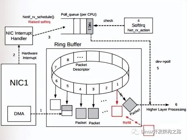 如图所示,物理介质上的数据帧到达后首先由NIC(网络适配器)读取,写入设备内部缓冲区Ring Buffer中,再由中断处理程序触发Softirq从中消费,Ring Buffer的大小因网卡设备而异。当网络数据包到达(生产)的速率快于内核处理(消费)的速率时,Ring Buffer很快会被填满,新来的数据包将被丢弃;