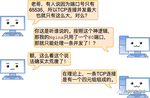很多同学看到这个问题的第一反应是 65535。原因是:“听说端口号最多有 65535 个,那长连接就最多保持 65535 个了”。是这样的吗?还有的人说:“应该受 TCP 连接里四元组的空间大小限制,算起来是 200 多万亿个!”