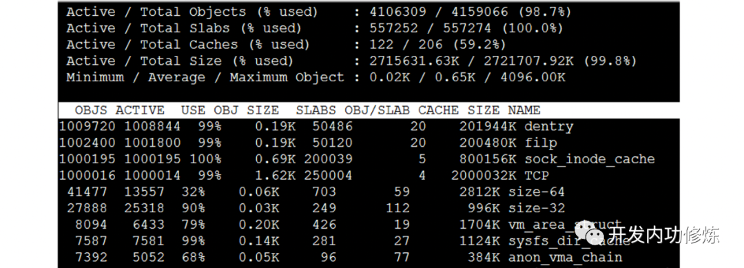 通过 slabtop 命令可以查看到 densty、flip、sock_inode_cache、TCP 四个内核对象都分别有 100W 个: