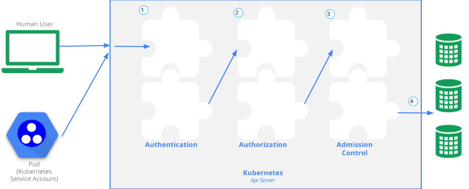 我们可以通过 kubectl、客户端库、发送 REST 请求 这几种方法访问 Kubernetes API。人类用户(User Account(KubeConfig)) 和 Kubernetes 的 Service Account 都可以被授权进行 API 访问。 请求到达 API Server 后会经过几个阶段,具体如下图所示: