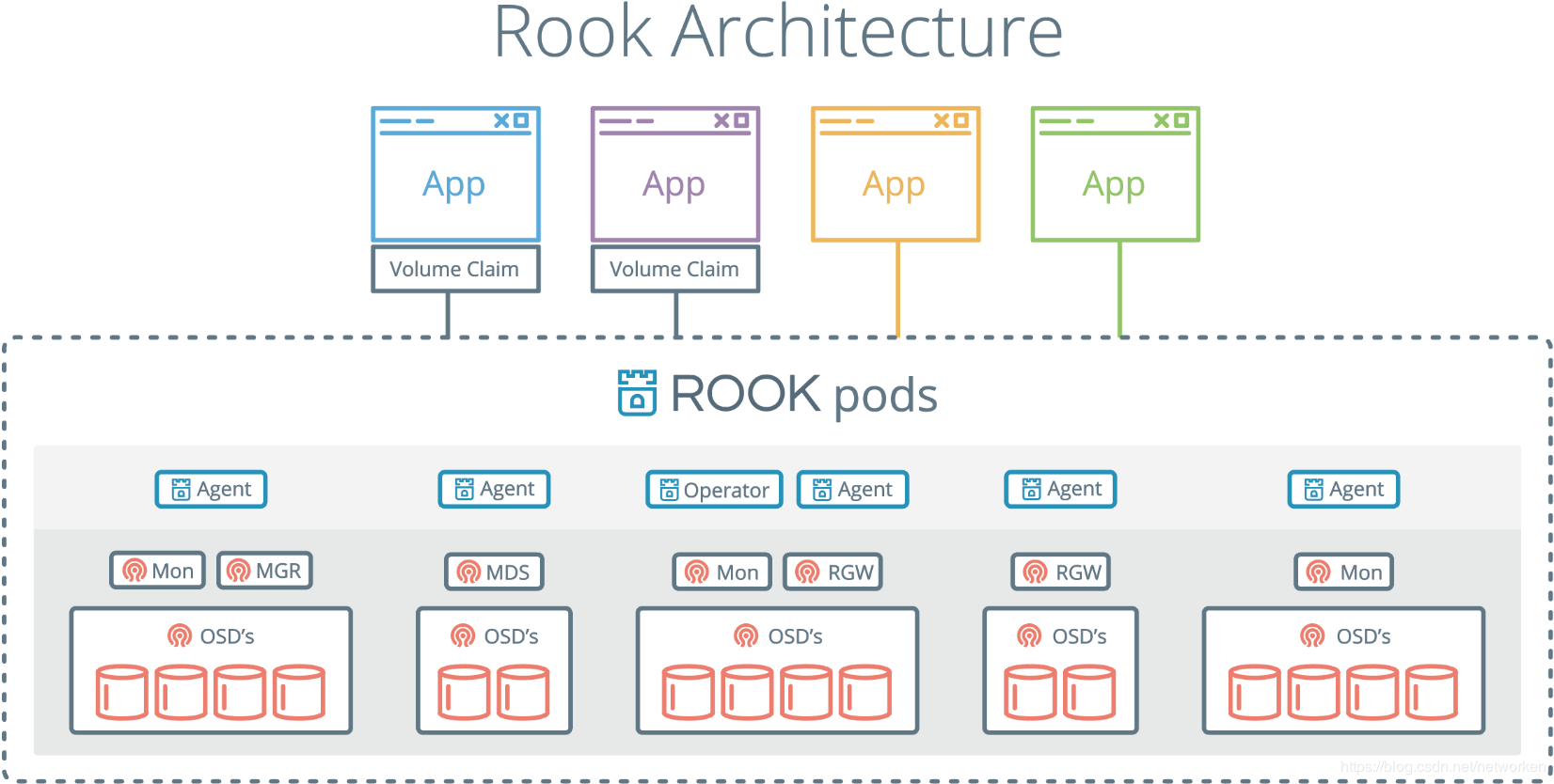 Rook 目前支持 Ceph、NFS、Minio Object Store、CockroachDB 等。这些存储的作用其中之一就是为各个业务提供存储空间,以便统一管理。e.g.使用 Rook 创建一个分布式的 ceph 集群,然后作为 k8s 集群的 storageClass,在某 Pod 需要使用卷的时候,可以直接从 ceph 集群中,拿去存储空间来使用。