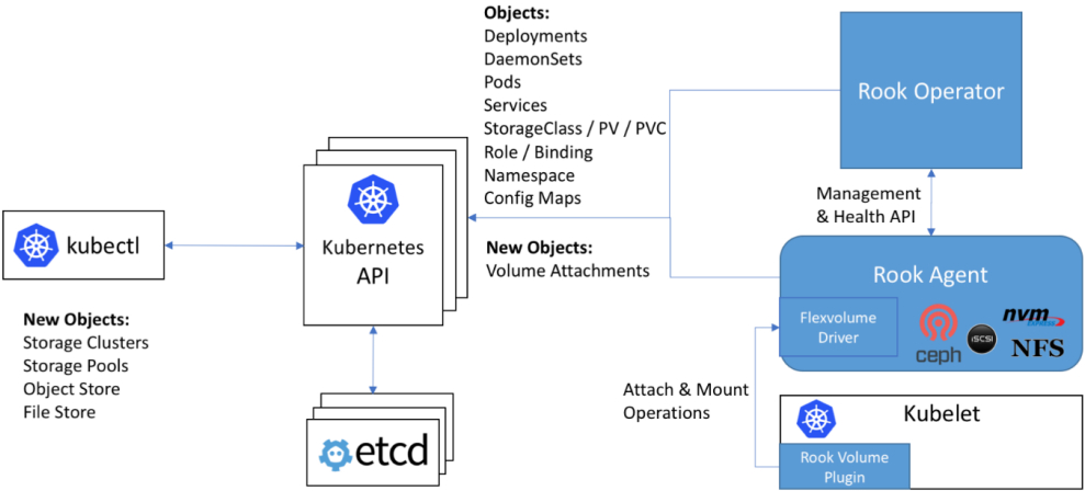 Rook oprerator 还创建了 Rook agent。这些 agent 是在每个 Kubernetes 节点上部署的 pod。每个 agent 都配置一个 Flexvolume 插件,该插件与 Kubernetes 的 volume controller 集成在一起。处理节点上所需的所有存储操作,例如附加网络存储设备,安装卷和格式化文件系统。