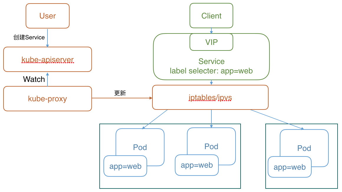 - service 在逻辑上代表了后端的多个 Pod,外界通过 service 访问 Pod。service 接收到的请求是如何转发到 Pod 的呢?这就是 kube-proxy 要完成的工作。接管系统的 iptables,所有到达 Service 的请求,都会根据 proxy 所定义的 iptables 的规则,进行 nat 转发