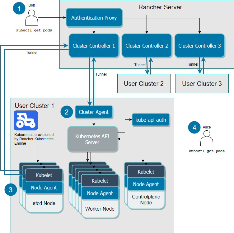 - 实现集群和 Rancher Server 之间的消息传输,包括事件,指标,健康状况和节点信息等。