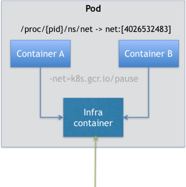 - Kubernetes 为每个 Pod 都附属了 k8s.gcr.ip/pause,这个 Container 只接管 Pod 的网络信息,业务 Container 通过加入网络 Container 的网络来实现网络共享。此容器随着 pod 创建而创建,随着 Pod 删除而删除。该容器是对业务 pod 的命名空间的解析。Note:如果想要更改该容器,则需要在 kubelet 中使用–pod-infra-container-image 参数进行配置
