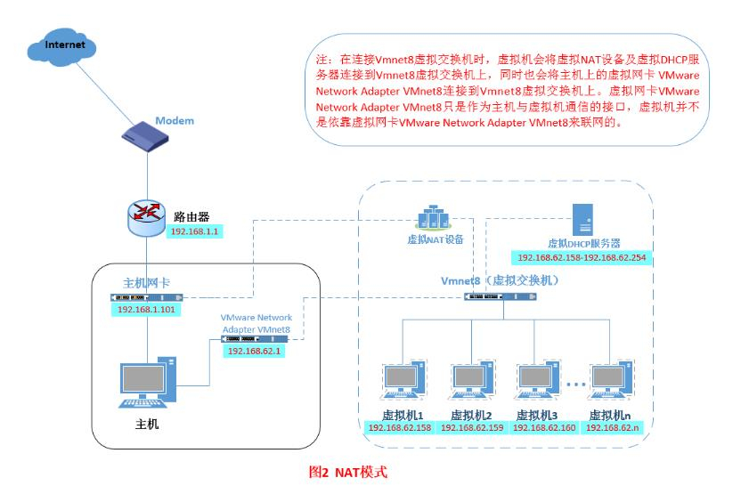 - 如图所示,VM 访问外网时通过虚拟 NAT 设备来进行外网访问的,可以把虚拟 NAT 设备当做一个具备 nat 功能的路由器,所以当给 VM 配置静态 IP 的时候,如果想连接外网,需要把网关配置成这个虚拟 NAT 设备上上端口的 IP,一般为 XXX.XXX.XXX.2.