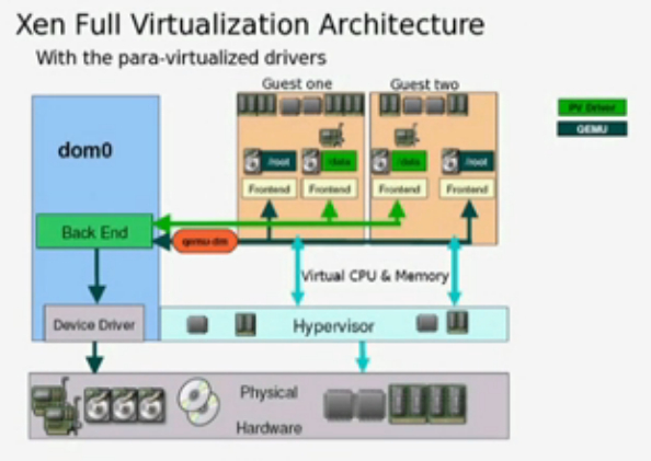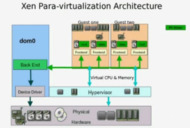 - Domain0:特权域,安装完 Hypervisor 后,自动生成的一个特权 Virtual Machine,负责管理整个 Xen 的 VM,可以直接访问硬件 IO 资源,修改 Linux Kernel 以实现半虚拟化功能