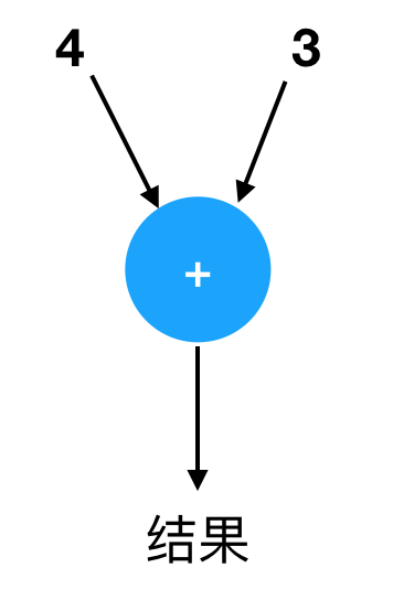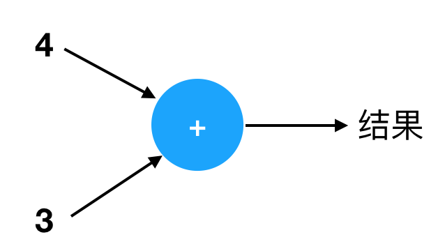 图中的箭头表示信息的流动方向。说到 “流动”,你可以想象一下水的流动。首先我们看到数字 4 和 3 流进了一个圆圈,圆圈里有一个“+” 号。这个圆圈就是你,一个会做手指加法的小孩。妈妈给你两个数 4 和 3,你现在把它们加起来,得到 7 作为结果。