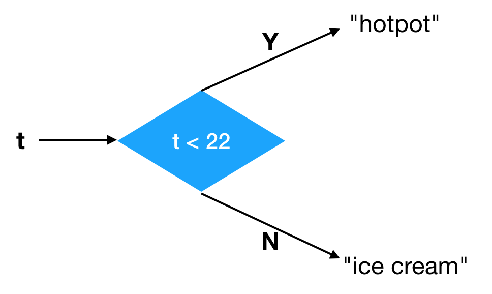 直到现在,我们的代码都是从头到尾,闷头闷脑地执行,不问任何问题。我们缺少一种 “问问题” 的方法。比如,如果我想表达这样一个“食物选择器”:如果气温低于 22 度,就返回 “hotpot” 表示今天吃火锅,否则返回 “ice cream” 表示今天吃冰激凌。