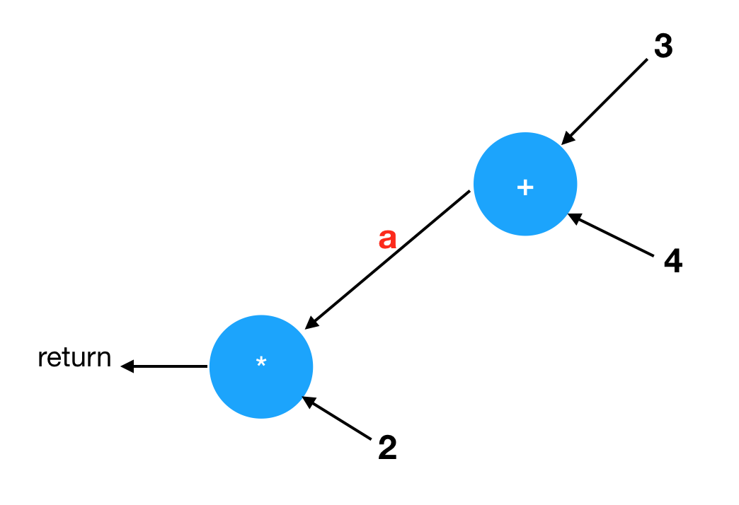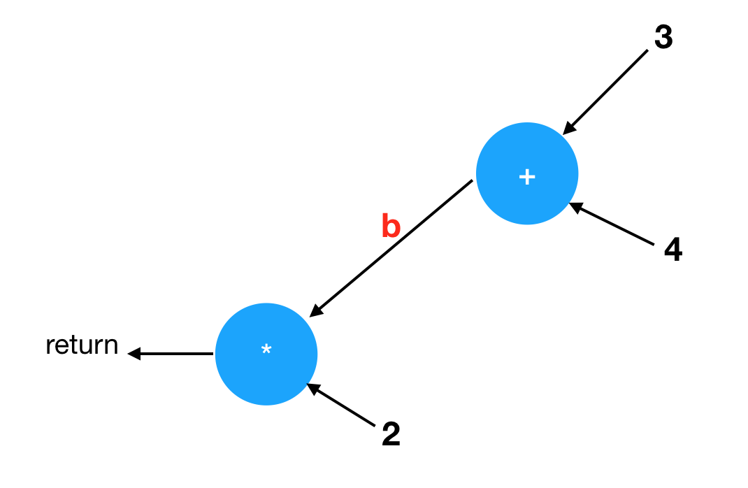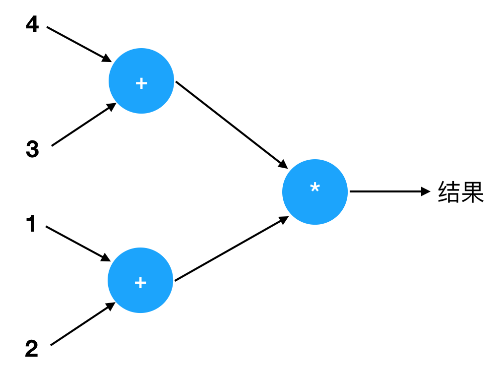 为什么要先计算 4 + 3 呢?因为当我们看到乘法器 2 * ... 的时候,其中一个输入(2)是已知的,而另外一个输入必须通过加法器的输出得到。加法器的结果是由 4 和 3 相加得到的,所以我们必须先计算 4 + 3,然后才能与 2 相乘。