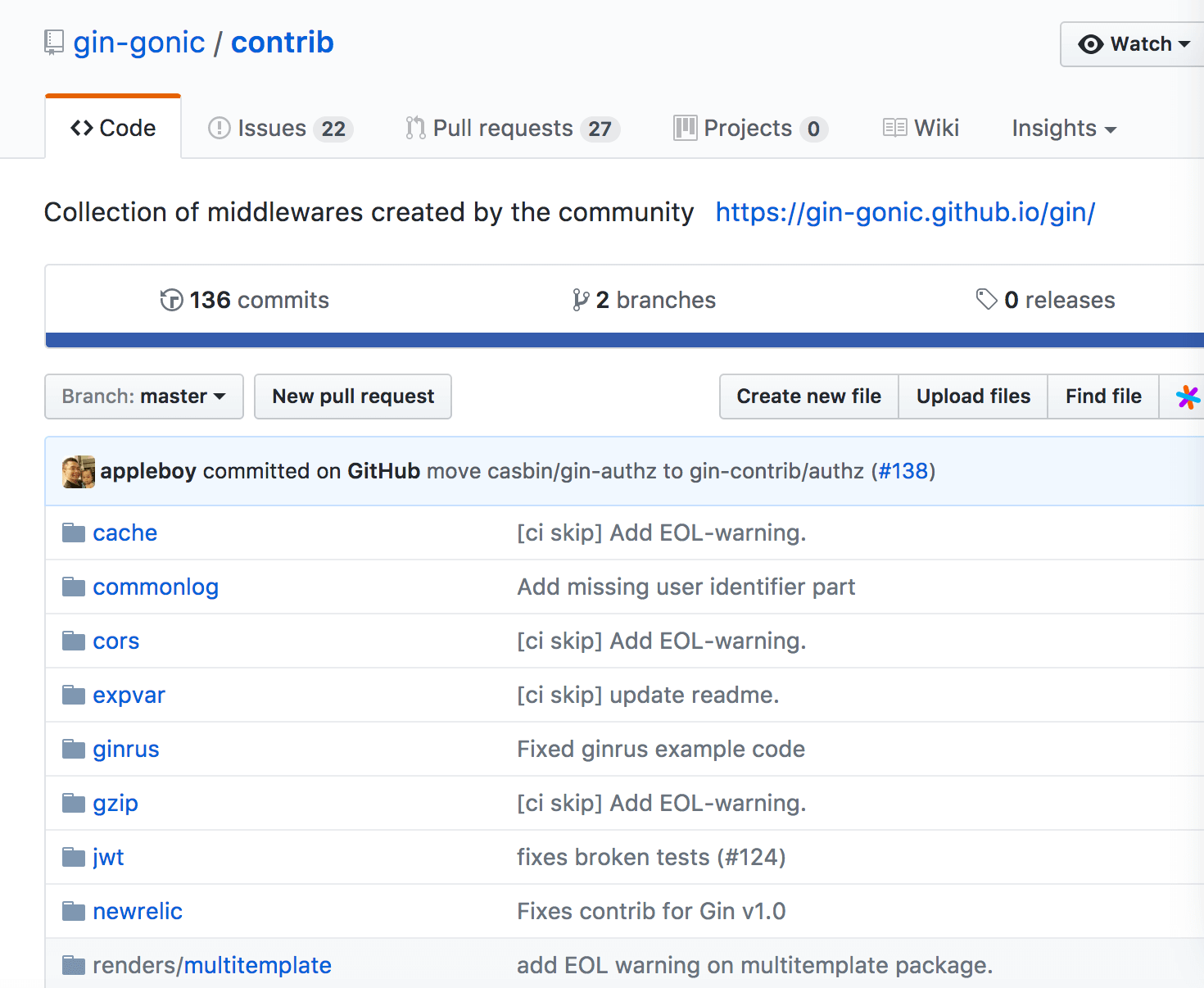 比如开源界很火的 gin 这个框架,就专门为用户贡献的中间件开了一个仓库,见_图 5-9_: