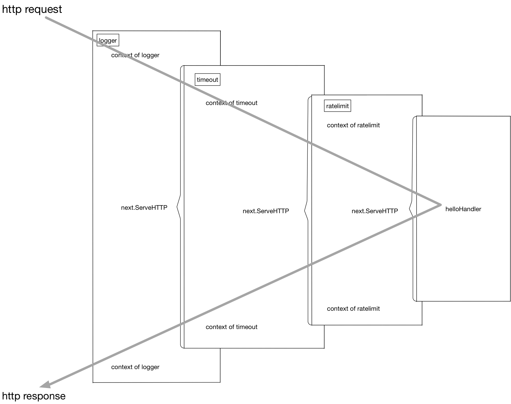 customizedHandler = logger(timeout(ratelimit(helloHandler)))
