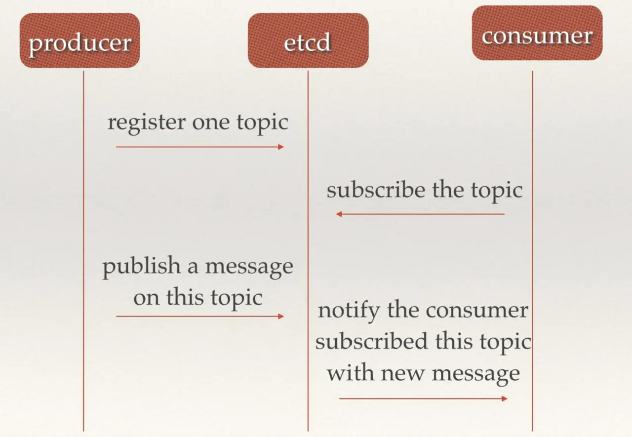 etcd 可以充当消息中间件,生产者可以往 etcd 中注册 topic 并发送消息,消费者从 etcd 中订阅 topic,来获取生产者发送至 etcd 中的消息。