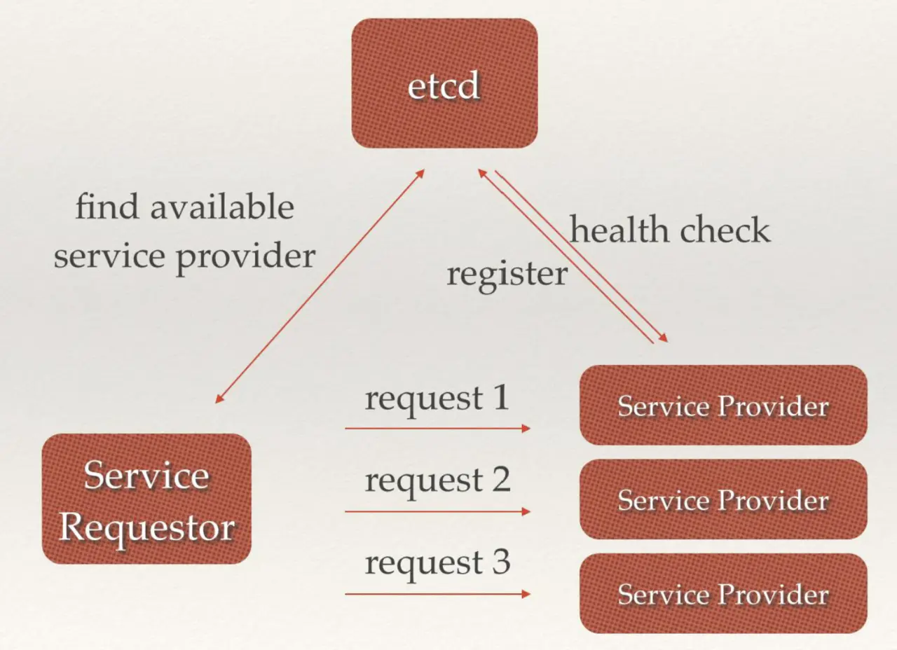 后端多组相同的服务提供者可以经自己服务注册到 etcd 中,etcd 并且会与注册的服务进行监控检查,服务请求这首先从 etcd 中获取到可用的服务提供者真正的 ip:port,然后对此多组服务发送请求,etcd 在其中充当了负载均衡的功能