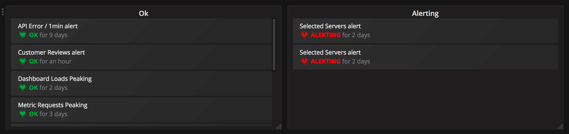 警报列表面板允许您显示仪表板警报。您可以配置列表以显示当前状态或最近的状态更改。您可以在“警报”概述中了解有关警报的更多信息。