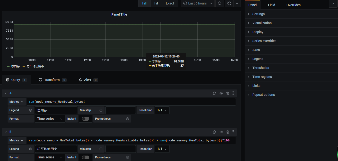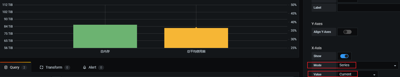 上面的例子,一个语句是内存用量,一个语句是内存使用率,单位是不一样(一个 KiB、一个百分比)。这时候,就需要使用 Series overrides,为每个 Serie 单独配置。不但单位可以分别配置,还可以将 Serie 移动到右侧的 Y 轴。还可以为不同的 series 配置不用的显示方式(比如有的用圆点、有点用线条、有的用柱状图,都可以在同一个面板显示出来)