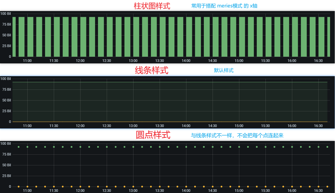 - Time # 时间模式。默认模式。X 轴 表示 时间,数据按时间分组(例如,按小时或分钟)。