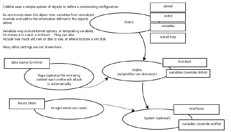Cobbler 的配置结构基于一组注册的对象。每个对象表示一个与另一个实体相关联的实体(该对象指向另一个对象,或者另一个对象指向该对象)。当一个对象指向另一个对象时,它就继承了被指向对象的数据,并可覆盖或添加更多特定信息。以下对象类型的定义