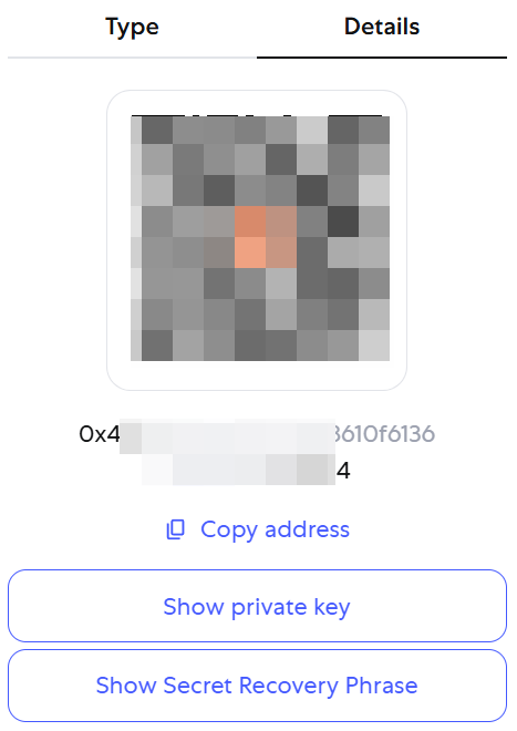 账户名下面的字符串是该钱包的 Address。查看钱包的细节,可以显示 Private key(私钥) 与 Secret Recovery Phrase(助记词),会发现: